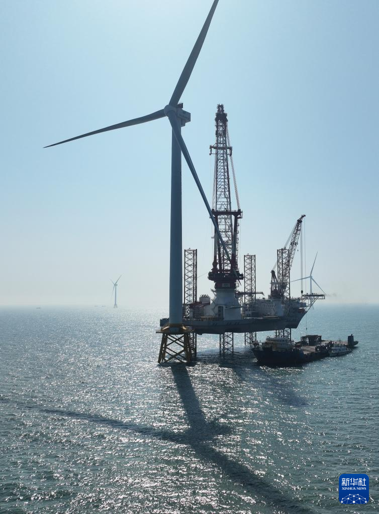 这是1月13日在闽南海域拍摄的20兆瓦海上风电机组和“大桥海风”号2000吨自升式海上风电安装平台(无人机照片)。新华社记者 林善传 摄