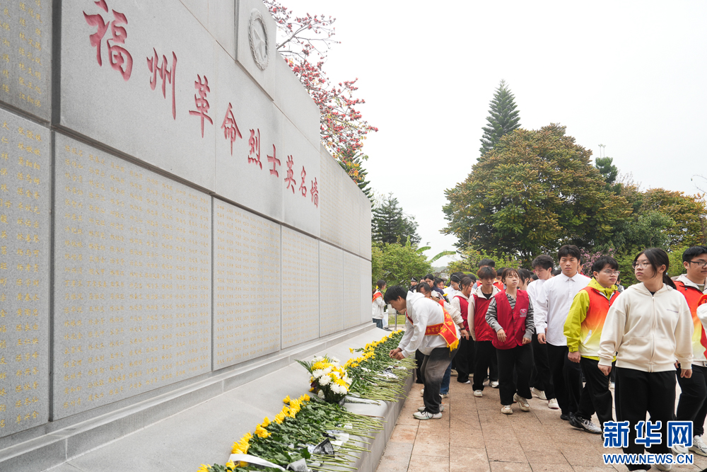 3月29日,学生代表向福州革命烈士英名墙敬献鲜花,缅怀英烈。新华网 肖和勇 摄