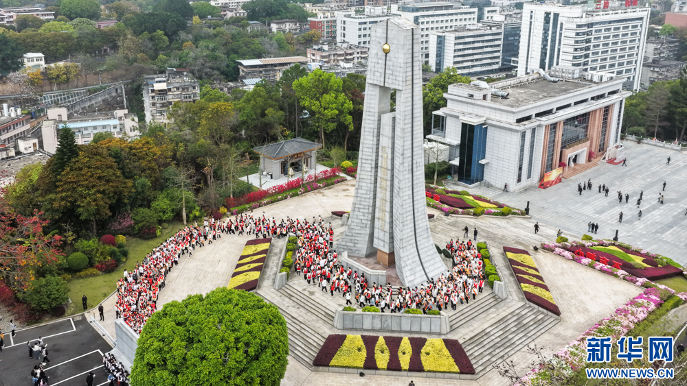 3月29日,学生代表向福州革命烈士英名墙敬献鲜花,缅怀英烈(无人机照片)。新华网 肖和勇 摄