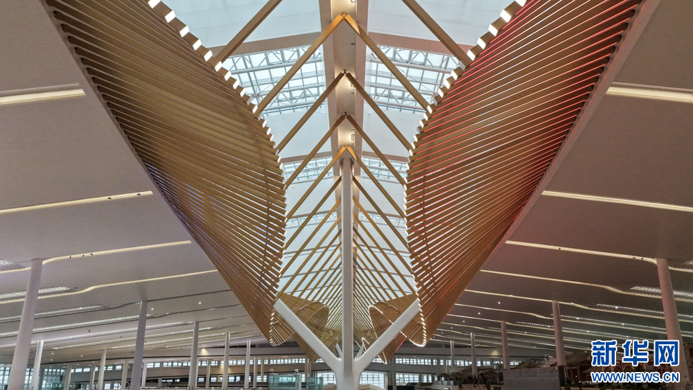 这是T1航站楼出发大厅内看到的天窗一隅,呈现船桨造型(3月31日摄,无人机照片)。新华网 肖和勇 摄