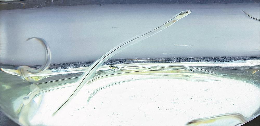 3月24日,记者走进陈仕玺教授团队的实验车间。车间里,窗帘紧闭,人眼视物非常吃力,3口人工繁育桶还用黑布作遮光处理。“鳗鲡不喜光,亲鱼和仔鱼更是。”陈仕玺教授揭开挡光布,在强光手电筒的照射下,才能稍稍看见刚孵化的鳗鲡仔鱼。只有在玻璃烧杯里,方可清晰看清它们的形态——呈透明针状,头朝上悬浮水中,如同洒入水中的点点星光。“存活数天后,它们才会躺平,呈现鳗型游姿。”陈仕玺教授拿出数尾存活6天的仔鱼进行对比并解释说,“新出生的鳗鲡仔鱼非常‘娇弱’,目前科研重心之一是研究开口饵料,通俗说就是让仔鱼快点吃饭,然后才能长大长壮。”