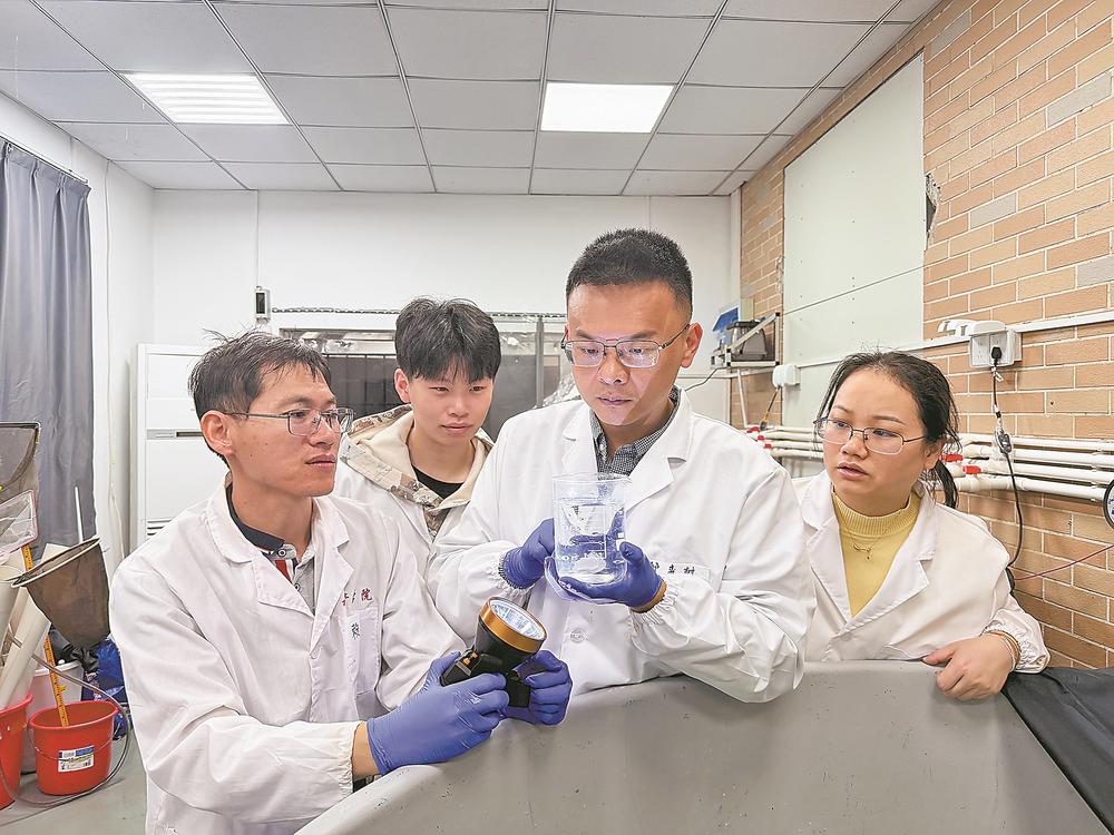 陈仕玺教授(右二)与团队成员正在观察刚出生的仔鱼。