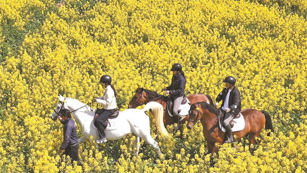 游客骑马穿行在油菜花田里,享受踏青之乐。