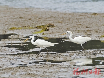 “快看,那群是黄嘴白鹭,1、2、3……足足有7只!”昨日上午,福清兴化湾科普节暨公众导赏活动现场,观鸟爱好者见到了“组团”亮相的国家一级保护动物黄嘴白鹭。