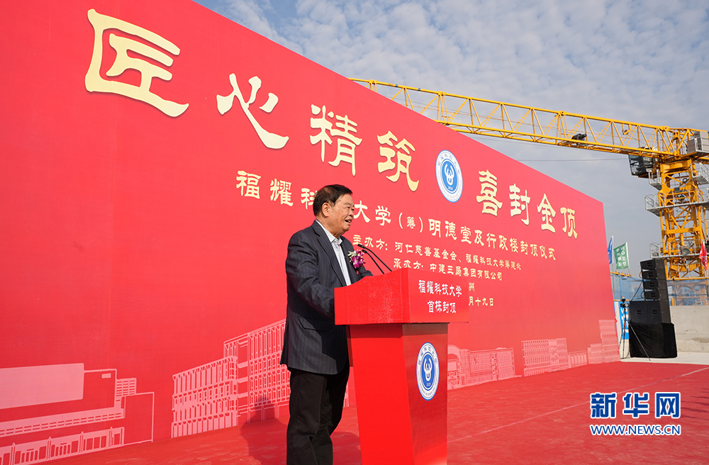 11月19日,福耀集团董事长、河仁慈善基金会第一理事长、福耀科技大学(筹)理事长曹德旺在明德堂及行政楼主体结构封顶仪式上致辞。新华网发(陈新星 倪跃嘉 摄)